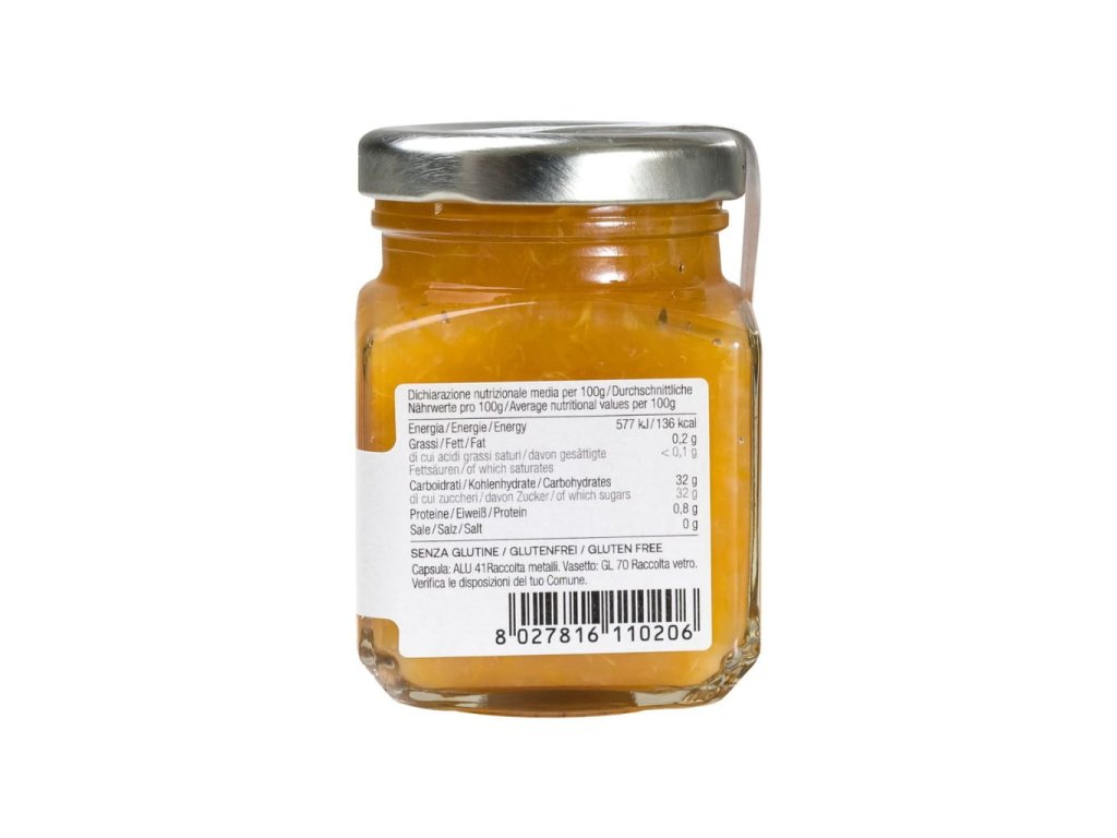 Tato pomerančová marmeláda v italském stylu je vyrobena z nejlepších sicilských pomerančů odrůd Navel a Tarocco, které tvoří 75 % obsahu. Obsahuje jemně nakrájenou kůru, která dodává produktu ušlechtilou, přirozenou hořkost a bohatou texturu. Díky vaření ve vakuu při nízkých teplotách chutná marmeláda jako čerstvě vymačkaný džus a neztrácí svou zářivou barvu ani po dlouhé době. Složení je 100% přírodní, bez konzervantů, umělých aromat a lepku.