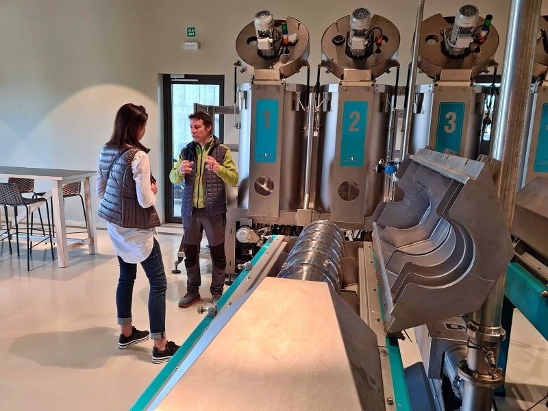 Mercedes Santiago z EVOO Acanto při prohlídce olivového mlýna Cooperativa San Sebastián nedaleko španělského Jaénu (foto 1). Tedi Chiavalon v novém mlýnu v městečku Vodnjan na chorvatské Istrii (foto 2).